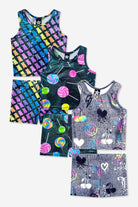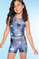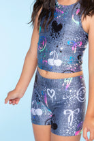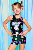 Our tumble short & cropped racerback tank set is the coolest tumble set around! This ultra-stretch outfit is made in our Foil Coated High Shine fabric. It’s perfect for dance, gymnastics, and cheer and can also be worn as separates! Please note: Any foiled or glitter fabric can wear over time.