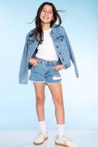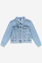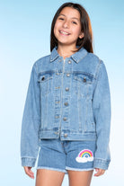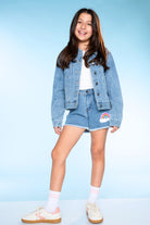 Our denim jacket is too cool for school! Just kidding, she can wear it to school too! This easy, slightly oversized style features a cool vintage wash and custom designed patches.