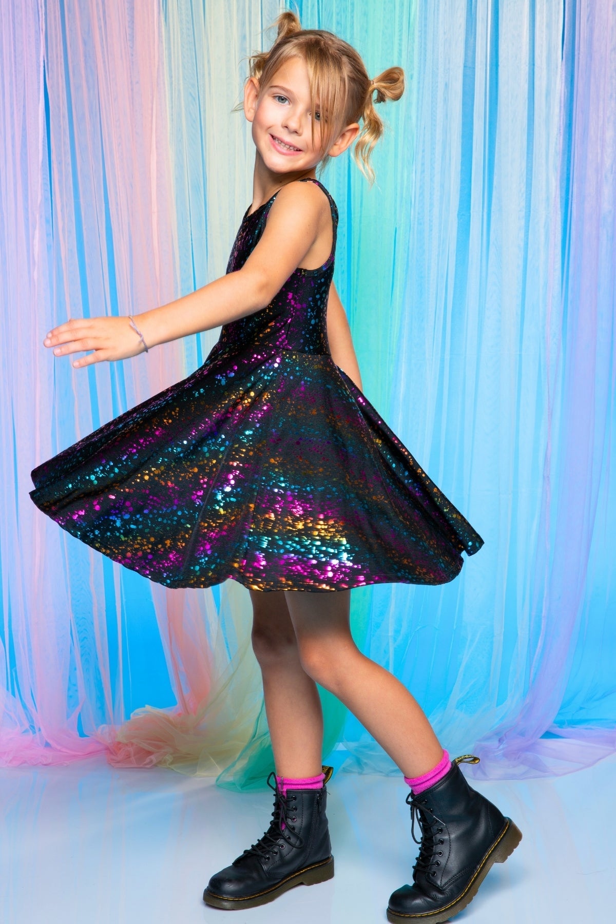 The ultimate twirl dress! This style is a total showstopper. Featuring a skater bottom with full skirt sweep and our glitter coated fabric, she is going to have all confidence in this beautiful and fun dress. Please note: Any foiled or glitter fabric needs to be worn gently. Any glitter, foil or coated fabric can wear over time.