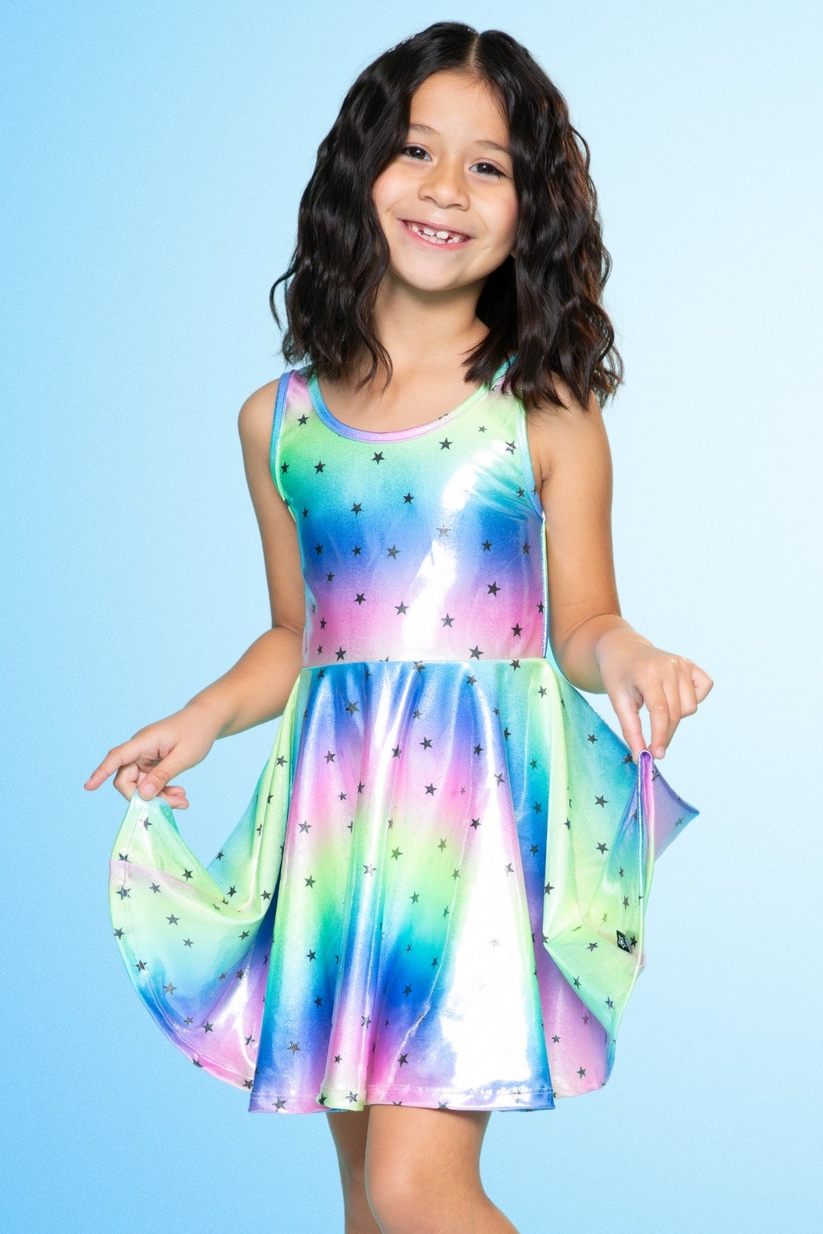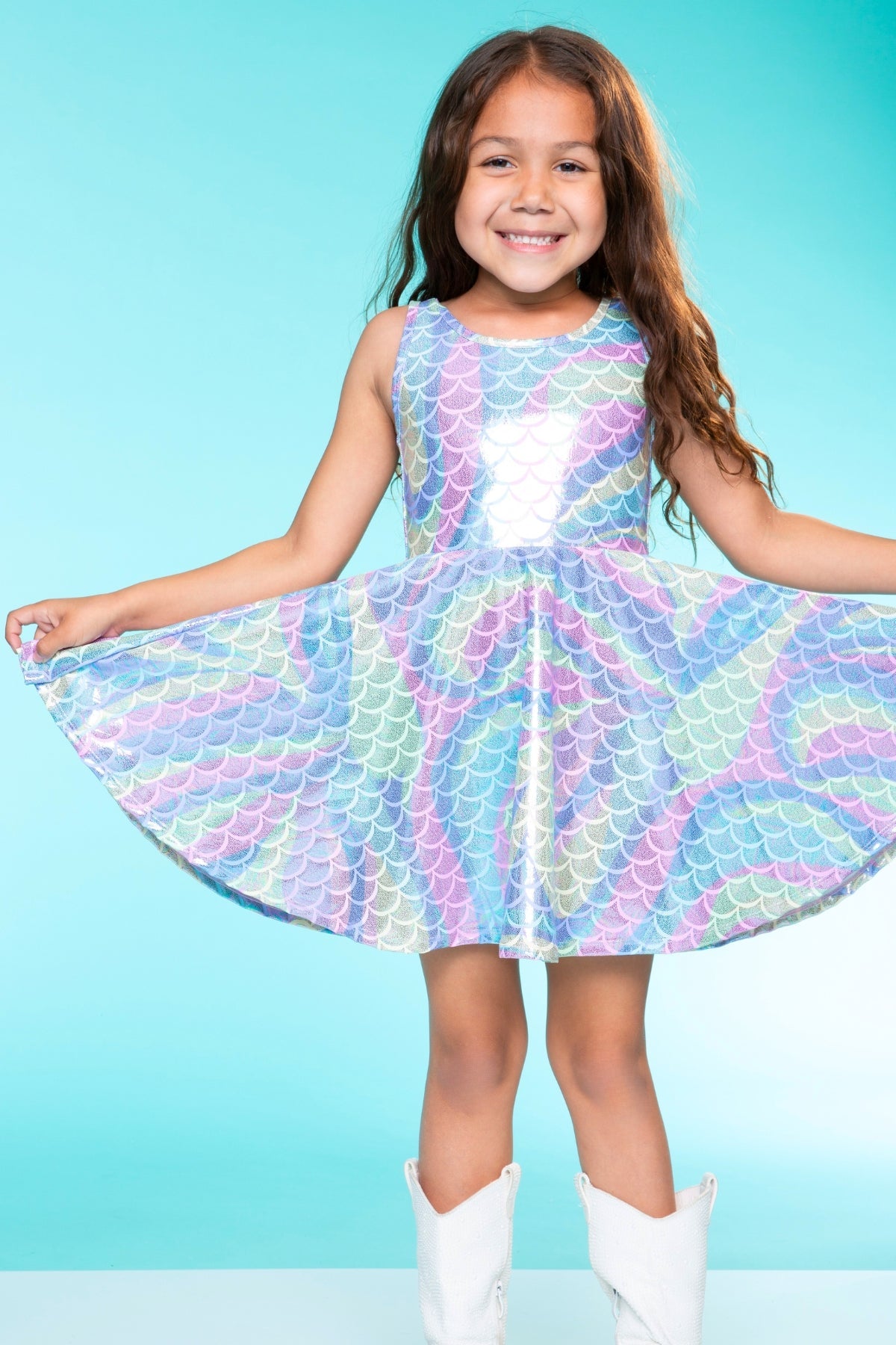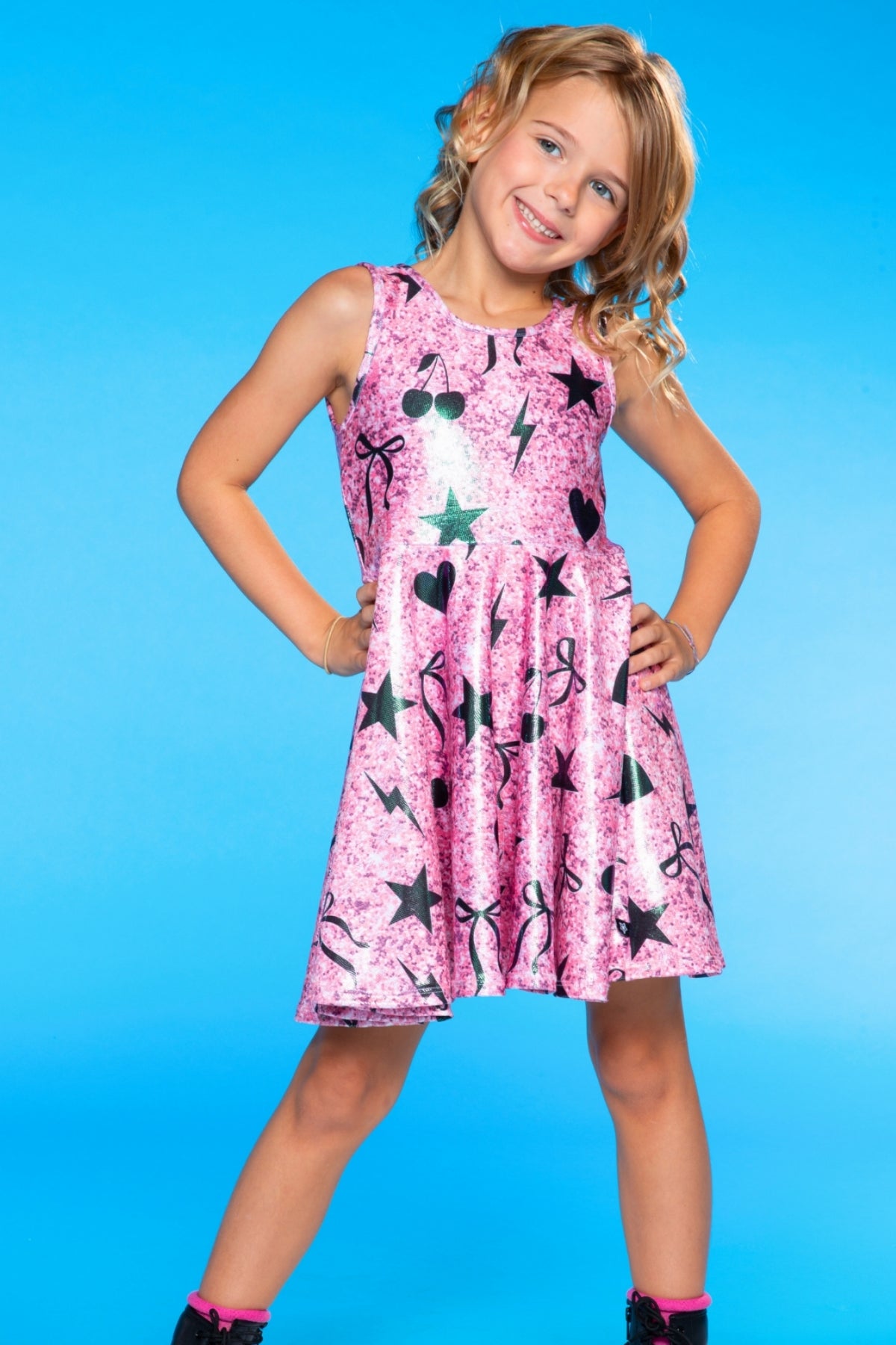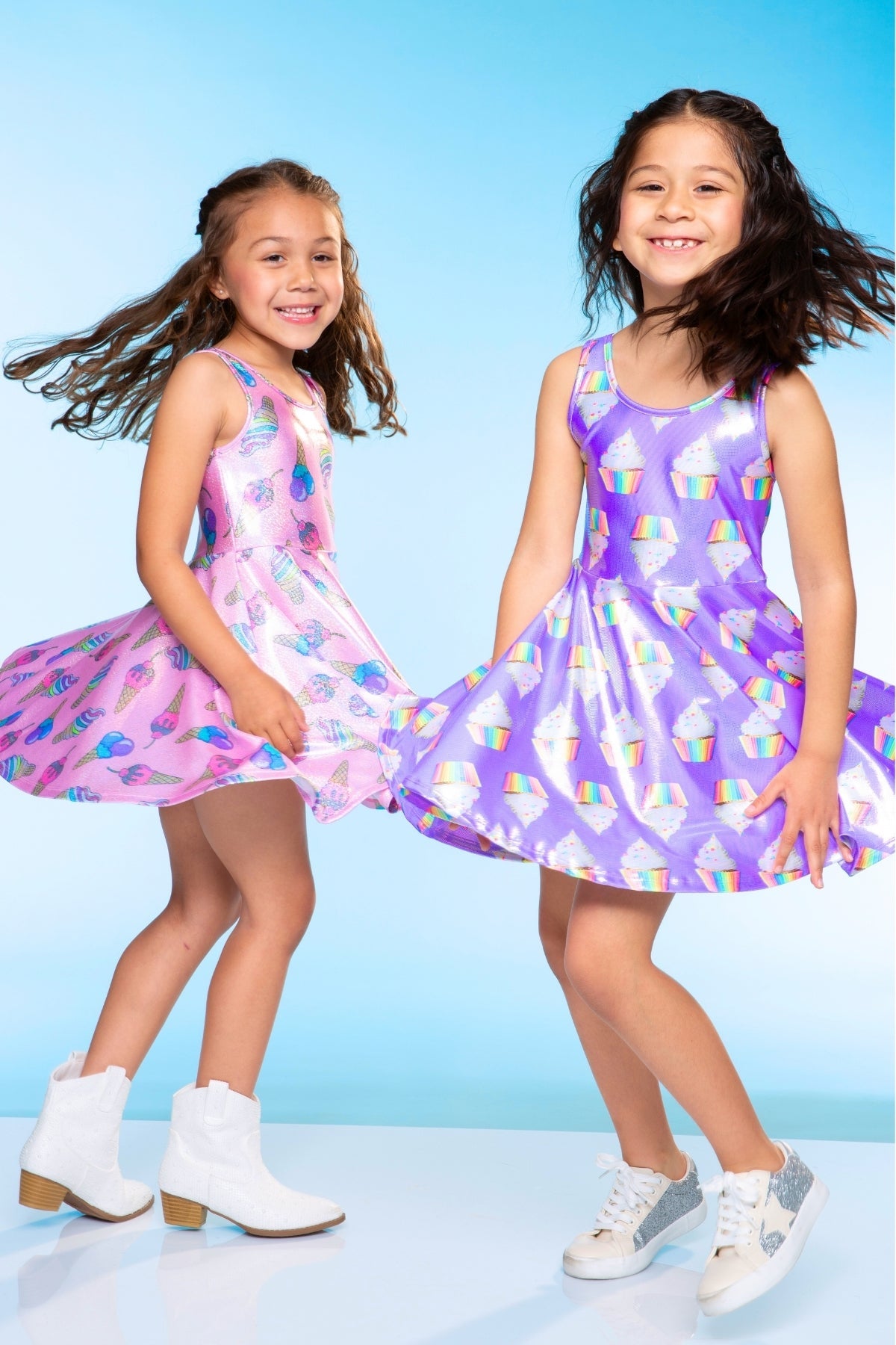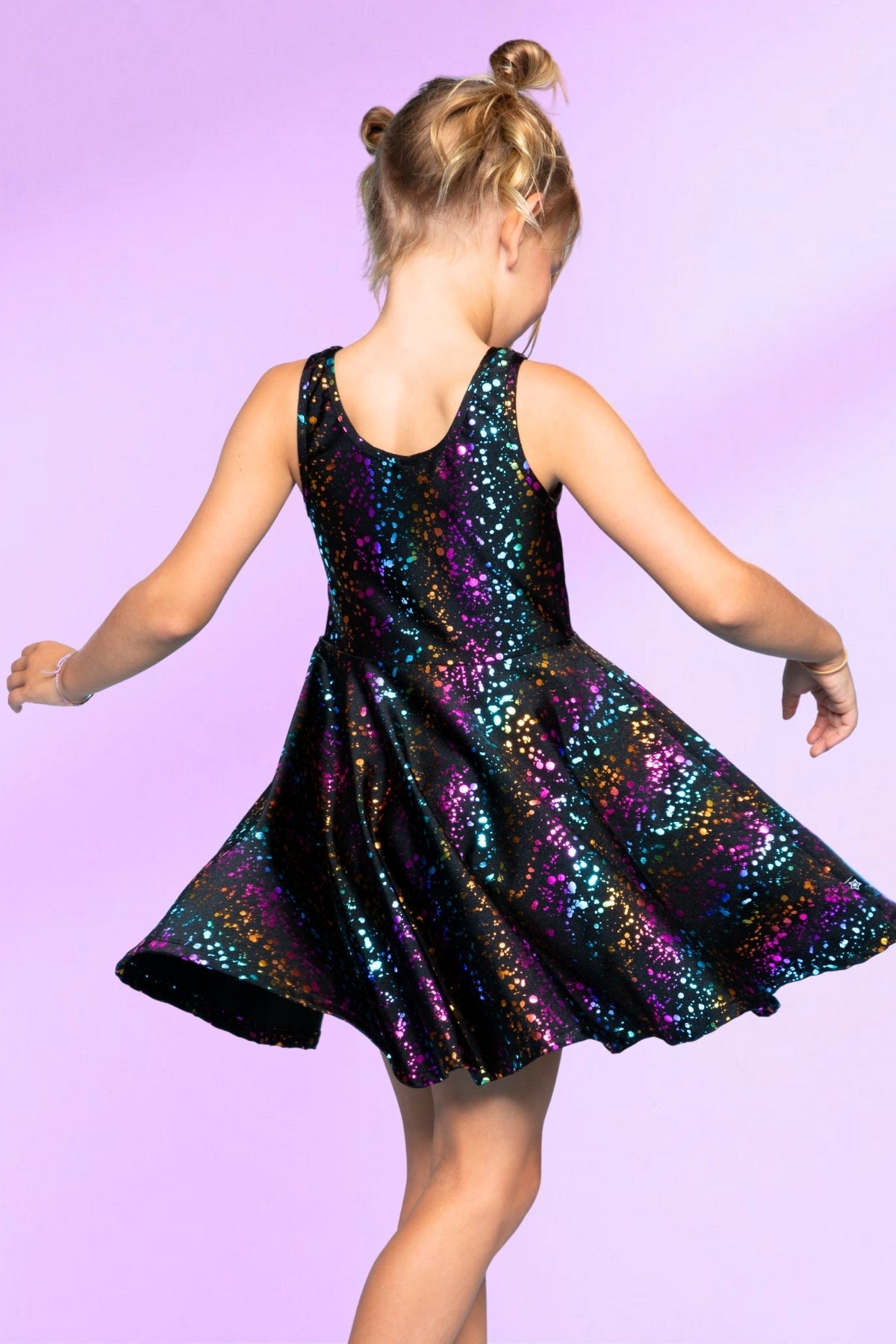 The ultimate twirl dress! This style is a total showstopper. Featuring a skater bottom with full skirt sweep and our High Shine fabric, she is going to have all confidence in this beautiful and fun dress.