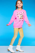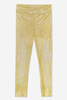Any foiled or glitter fabric needs to be worn gently. Any glitter, foil or coated fabric can wear over time. The glitter coating on leggings can get worn at the knees if child wears on playground or rough play.