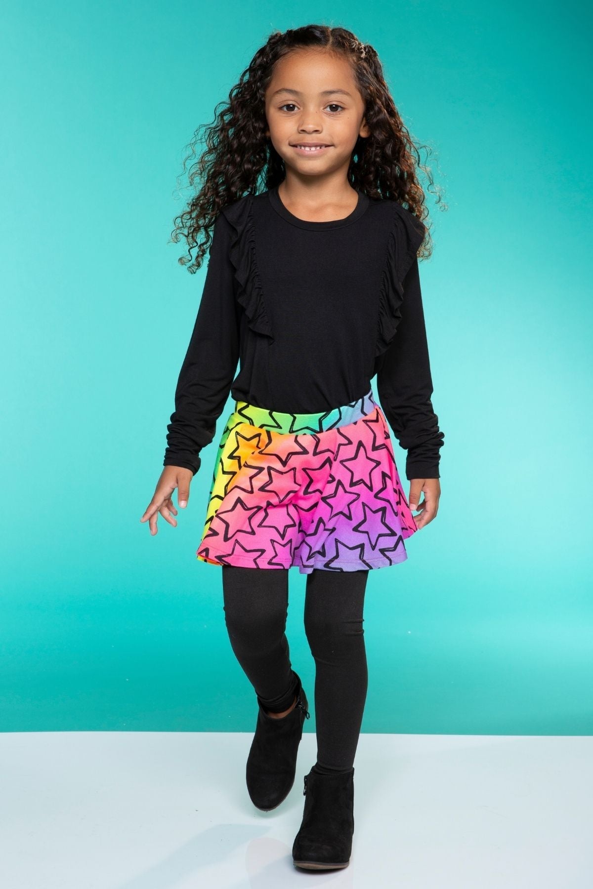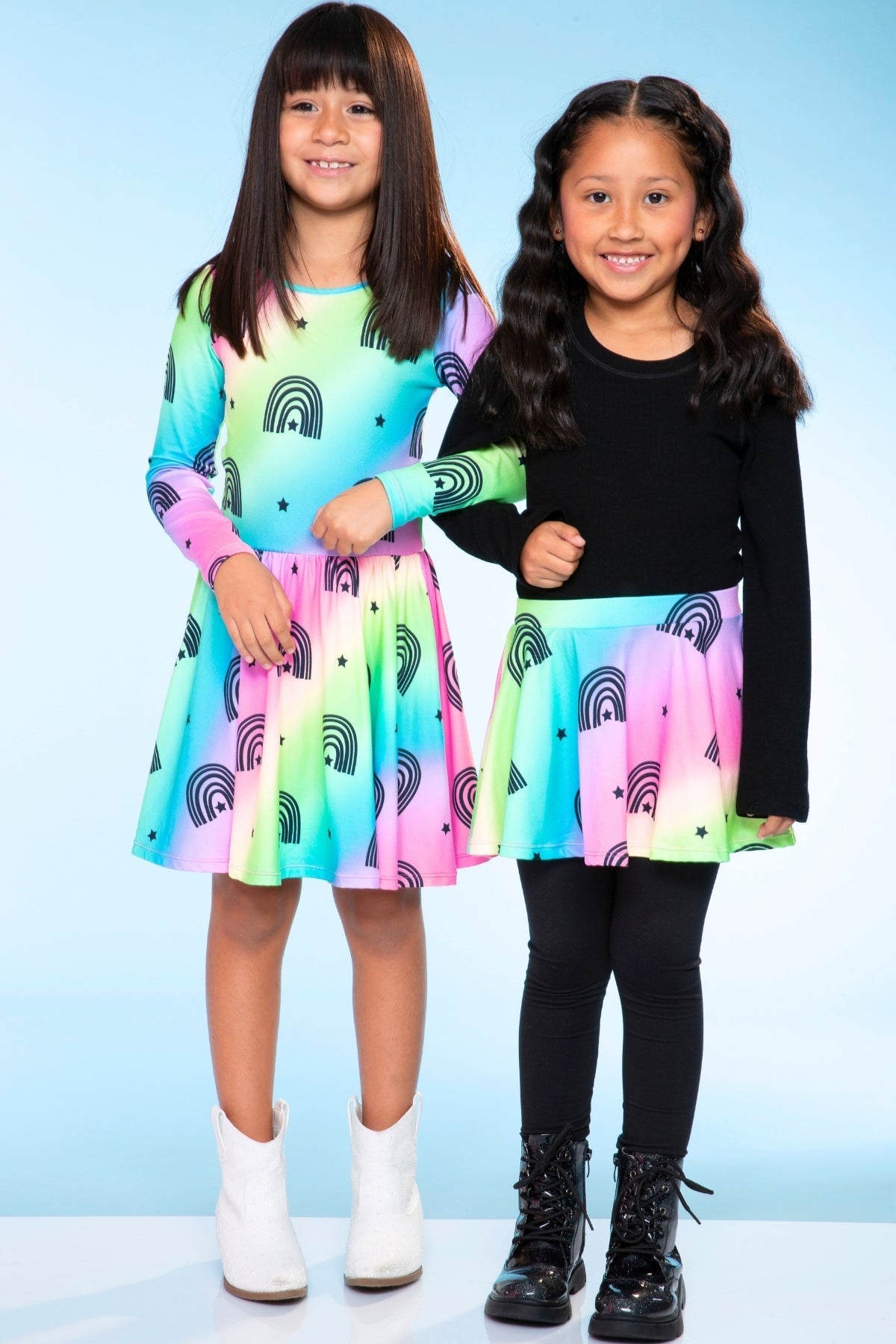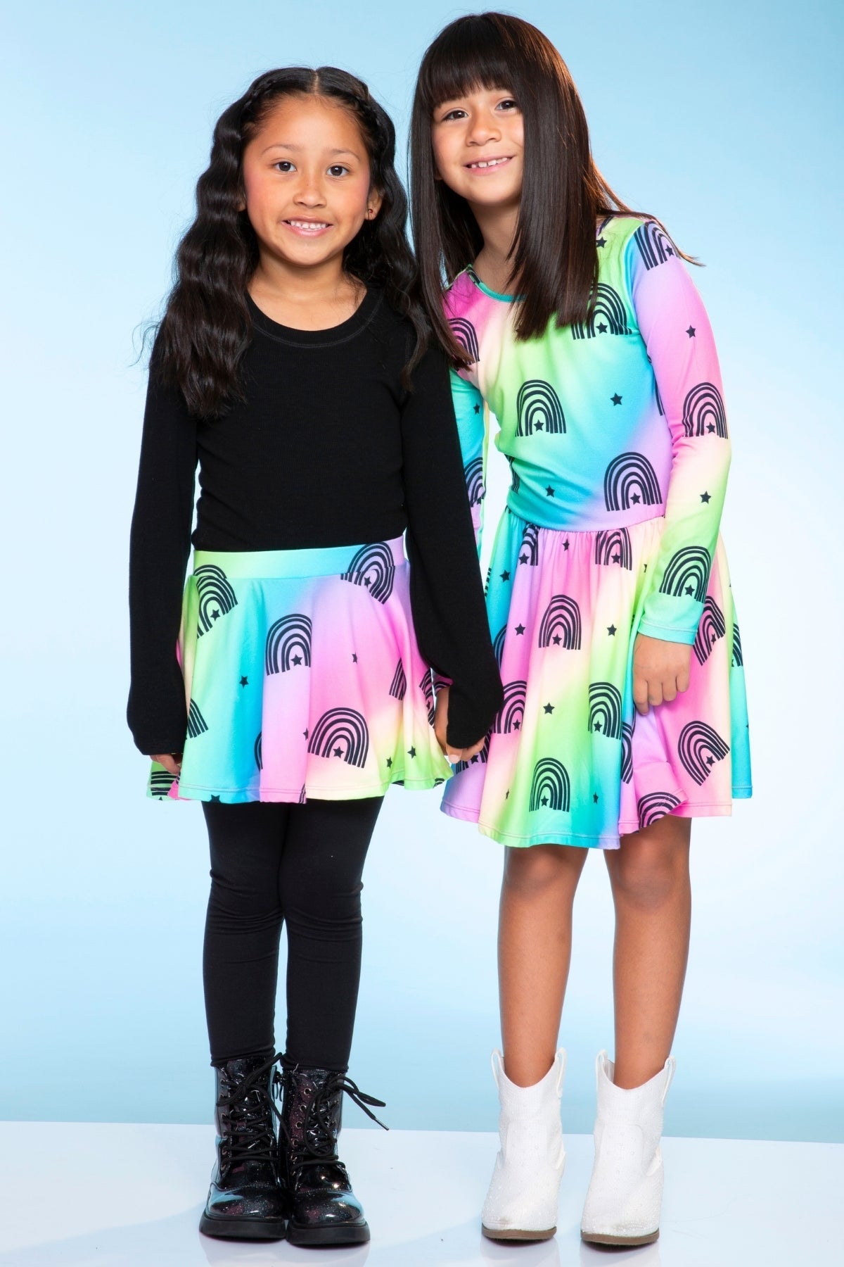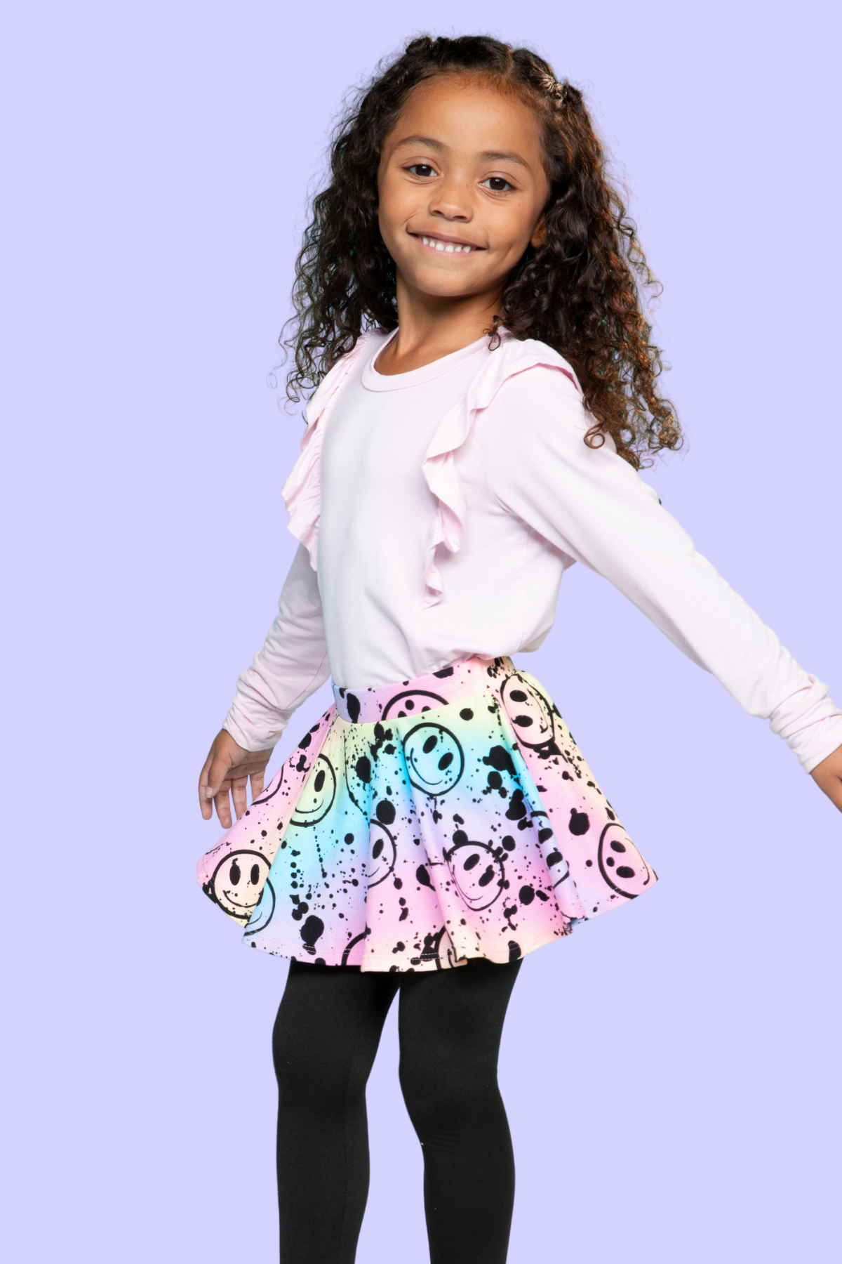 Our skater legging features a 2 in 1 skater skirt with buttery, soft leggings attached! Made in our Simply Soft fabric, pair this back to any of our PixieLane solid or graphic tops, and layer with a zip hoodie for a cool, cozy vibe!