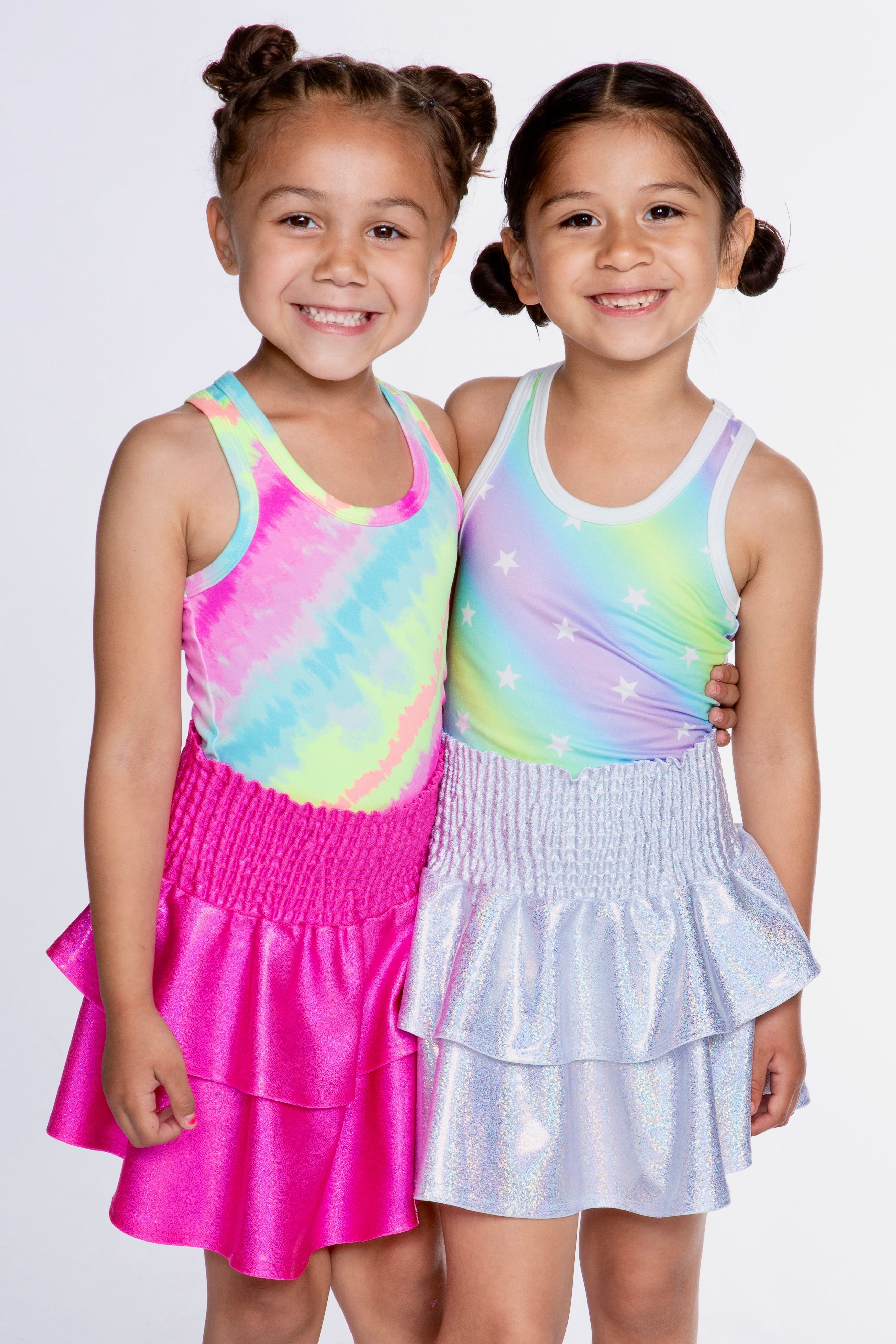 This style features a smocked waistband, two tiers of ruffles. This style features our shiny, glitter-looking, ultra-stretchy fabric quality. It's the perfect mix of feminine & edgy!